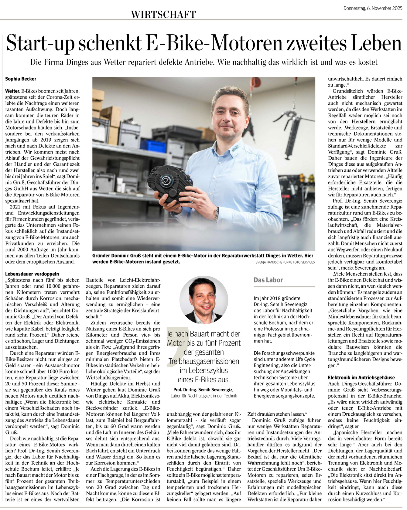In der Ausgabe vom 06. November 2025 setzte sich die Westfalenpost in einem Artikel mit der Reparatur von E-Bike-Motoren auseinander. In diesem Artikel kommt auch Prof. Dr.-Ing. Semih Severengiz zu Wort, um fundierte nachhaltigkeitswissenschaftliche Perspektiven auf dieses komplexe Thema anzuführen. Hierfür konnte er auf die intensive Forschung des Labors für Nachhaltigkeit in der Technik in zahlreichen Forschungsprojekten zu Themenbereichen wie Light Electric Vehicles und Zirkularität zurückgreifen (Autorin des Artikels ist Frau Sophia Becker).