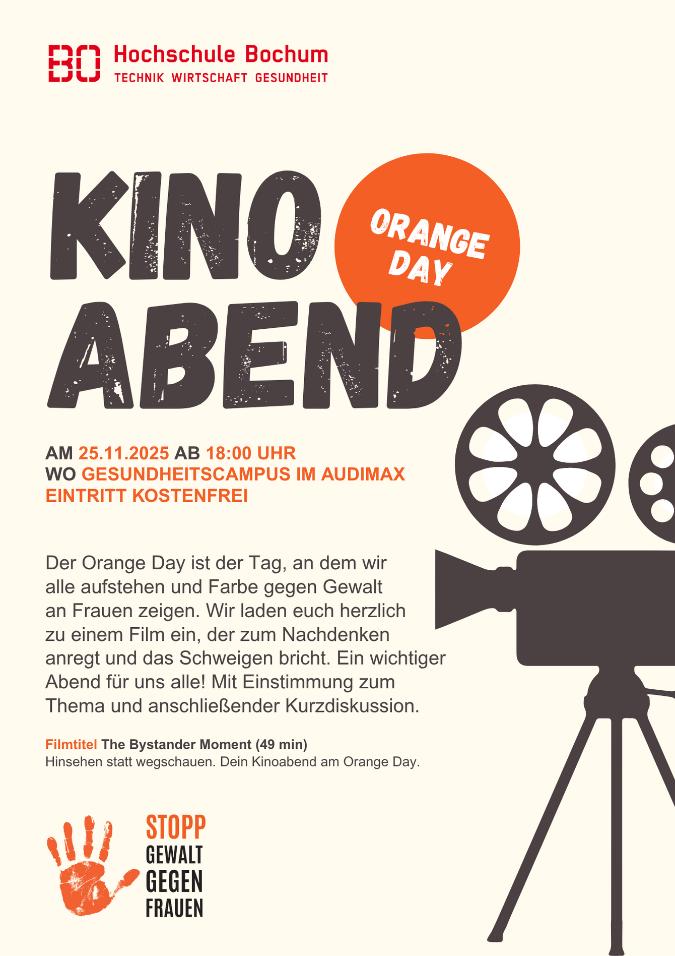 Der Orange Day erinnert daran, dass Gewalt gegen Frauen weltweit eine der häufigsten Menschenrechtsverletzungen ist. Unter dem Motto „Orange the World“ setzen Menschen und Institutionen weltweit ein Zeichen. Die Hochschule Bochum beteiligt sich aktiv – als Teil ihrer gesellschaftlichen Verantwortung und ihres Engagements für Chancengleichheit, Respekt und Sicherheit auf allen Campus.