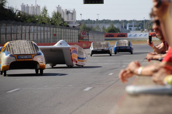 Und endlich – die grüne Flagge wird geschwenkt, die Fahrer stürmen los, angefeuert von ihren Teams auf der Tribüne und entlang des Startbereichs. Der thyssenkrupp SunRiser, der bei der Auslosung nicht gerade die Poleposition erwischt hatte (Start von Platz 12), schiebt sich als Erster aus der Reihe und auch die anderen Bochumer SolarCars folgen zügig.
