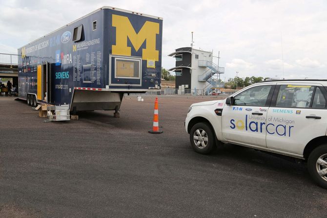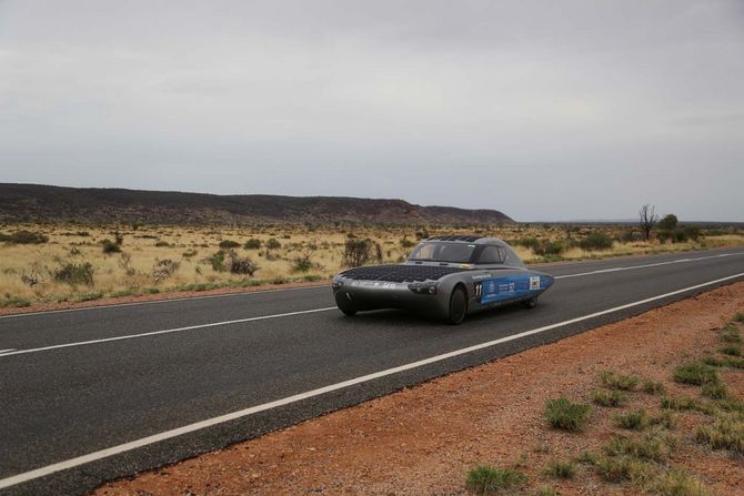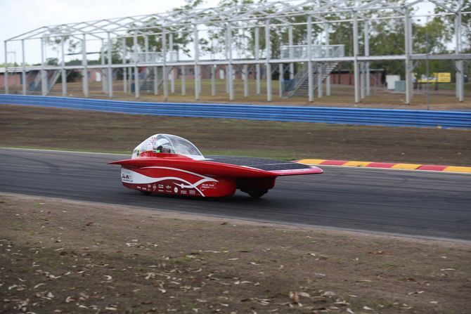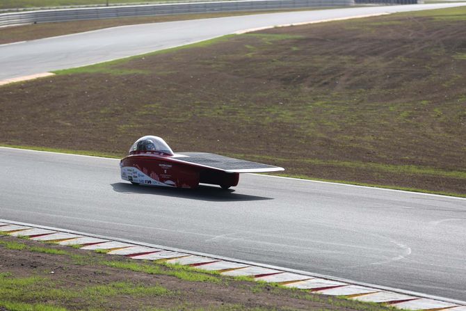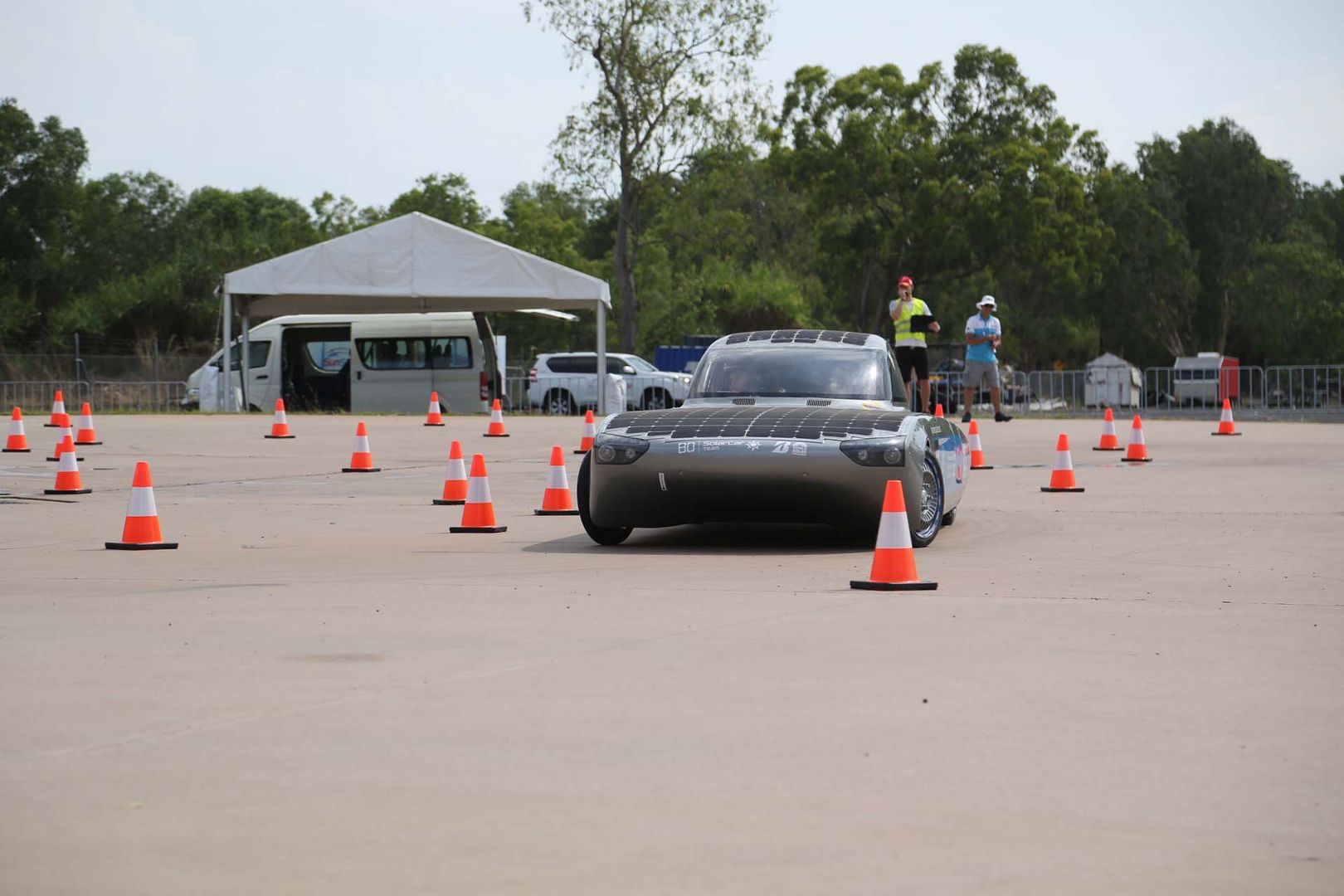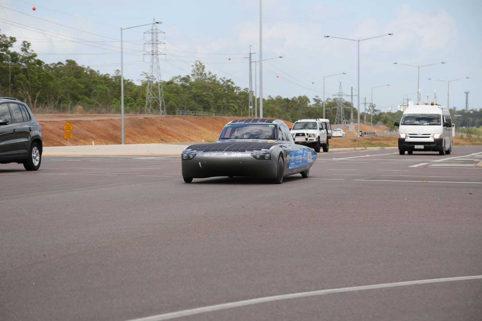 Zwei laufende Motoren reichen für den Race Track und man muss ja auch nur zwei Runden fahren und danach noch Stabilitäts- und Bremstest bestehen. Wenn das geschafft ist, darf man mitfahren bei der Bridgestone World Solar Challenge 2017.