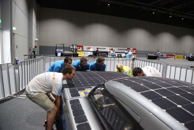 Heute startet das "Static Scrutineering", die Bochumer müssen erst am Donnerstag antreten. Vorab auf jeden Fall eine gute Gelegenheit, die Konkurrenz in Augenschein zu nehmen. Mit Media-Ausweis darf man ganz nah an die Solarcars heran und kann im Detail begutachten, wie gut die Fertigung gelungen ist. Ein breite Spanne ist zu sehen: Einerseits mehr als Daumenbreite Spaltmaße und exzessive Verwendung von Klebeband und Silikon, andererseits perfektes Oberflächenfinish bei Sichtcarbon und Fahrwerksteilen. Hier stehen noch Solarzellen ab, weil sich die Verklebung gelöst hat, dort elegant mehrdimensional gebogenen Solargeneratoren, die für sich allein schon ein Kunstwerk darstellen könnten.
