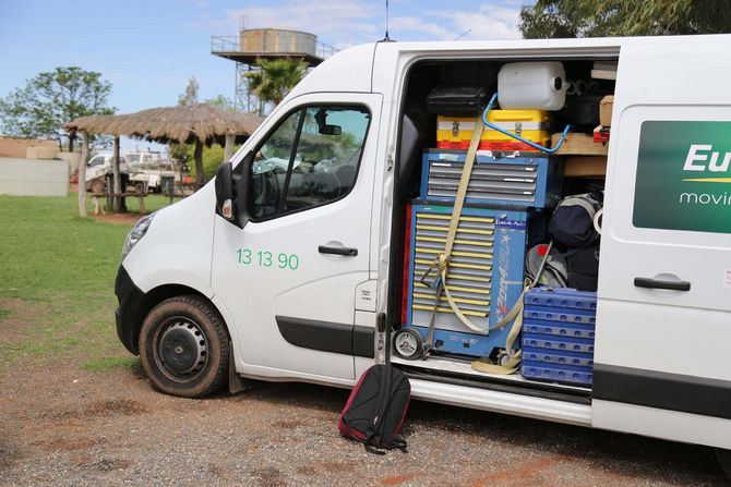 Vor der Werkstatt steht großes Reinemachen auf der Tagesordnung. Die Begleitfahrzeuge werden gewaschen und natürlich bekommt auch der Innenraum eine pflegende Generalüberholung. Man könnte meinen, es wäre Samstag und man sei noch in Deutschland.