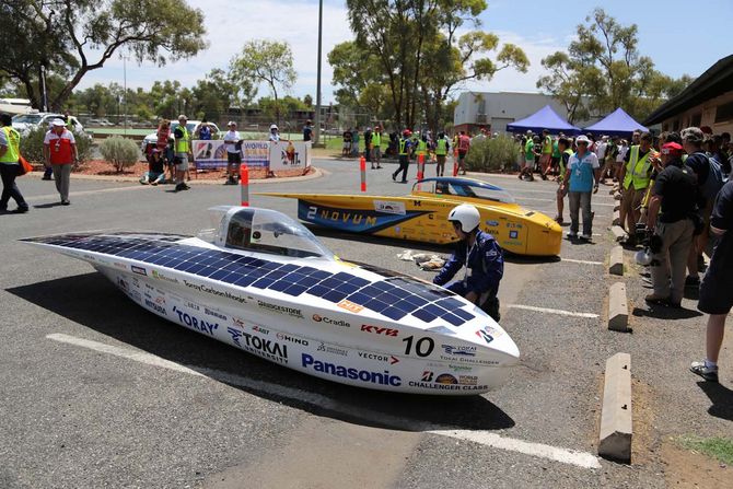Zur gleichen Zeit werden im Convention Center von Darwin die Top-Challenger zur Begutachtung vorgeführt. Man kann zur Sinnhaftigkeit dieser Fahrzeugklasse im Wettbewerb stehen wie man will: Hier sieht man perfekte Ingenieurskunst bei allen Teams. Die Regeln haben sich geändert, die Fläche der Solarzellen wurde nochmals verkleinert. Gallium-Arsenid-Zellen dürfen 3,56 qm Fläche einnehmen, Silizium 4 qm, spezielle hocheffektive Mehrschicht-Zellen sind begrenzt auf 2,64 qm.