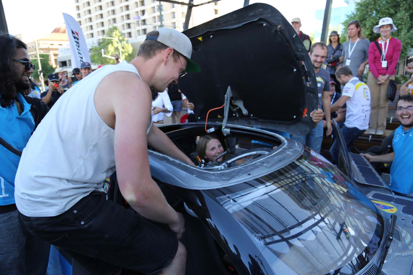 Immer wieder ein beeindruckendes Bild, wenn sich die Zukunft der individuellen Mobilität in Form von über 40 Solar-betriebenen Fahrzeugen auf den Straßen von Adelaide manifestiert. Alle Formen und Farben bilden einen bunten Reigen weltweiter Ingenieurskunst. Ein bunter Strauß von Visionen, mehr oder weniger realistisch und alltagsnah, fährt in 5 Minuten an den begeisterten Passanten vorbei. Hier fällt der Bochumer Beitrag auf, weil er so normal, wie ein „richtiges“ und dazu noch besonders schickes Auto aussieht. Die letzten Kilometer auf australischem Asphalt, morgen geht es in den Container. Anfang des nächsten Jahres soll er wieder deutschen Boden erreichen.