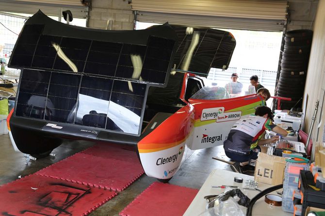 Heute startet das "Static Scrutineering", die Bochumer müssen erst am Donnerstag antreten. Vorab auf jeden Fall eine gute Gelegenheit, die Konkurrenz in Augenschein zu nehmen. Mit Media-Ausweis darf man ganz nah an die Solarcars heran und kann im Detail begutachten, wie gut die Fertigung gelungen ist. Ein breite Spanne ist zu sehen: Einerseits mehr als Daumenbreite Spaltmaße und exzessive Verwendung von Klebeband und Silikon, andererseits perfektes Oberflächenfinish bei Sichtcarbon und Fahrwerksteilen. Hier stehen noch Solarzellen ab, weil sich die Verklebung gelöst hat, dort elegant mehrdimensional gebogenen Solargeneratoren, die für sich allein schon ein Kunstwerk darstellen könnten.