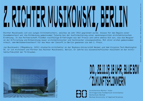 Richter Musikowski ist ein junges Architekturbüro, welches im Jahr 2012 gegründet wurde. Anlass für den Beginn einer Zusammenarbeit war die Entdeckung gemeinsamer Talente bei der Ausformulierung einer spannungsvollen architektonischen Erzählung. In die Partnerschaft fließen vielfältige Erfahrungen aus der Praxis und Lehre ebenso mit ein, wie die Neugier an der Erforschung und Entwicklung neuer architektonischer und technischer Lösungsansätze. Mit ihrer ersten gemeinsamen Arbeit, dem Wettbewerbsentwurf für das Haus der Zukunft in Berlin gewannen sie den 1. Preis.